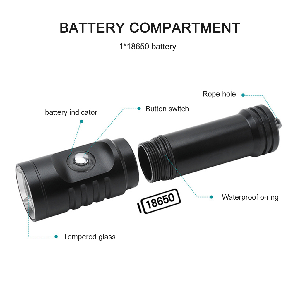 Diving Dive Light TorchBrand Name: AsafeeModel Number: AF01DBulb: XM-L2 LEDEmitting Color: whiteSwitch Mode: High>Low>SOSNet Weight: 110gDimensions: 130mm(length) x 27mm(diameter) x 30mm(head)The latest L2 LED provides greater light intensity and uniformity compared to conventional T5/T6 or U2 LED lamps!LED life: 100,000 hoursMade of high quality anodized aluminum alloy extremely scratch-proof and corrosion resistantCan accommodate up to 80 meters water depth divingIntegrated cool surface on the lamp head ensures low heat in spite of high performanceAdjustable light intensity under water operatedContinuously changing light intensity by slightly moving the switchSealed waterproof designDurable, double-lubricated O-ring seals provides double security to function under water3-optically tuned mirror reflector for optimal light outputPowered by 1 x 3.7V 18650 BatteryBest suited for: Diving, camping, hiking, trekking, hunting, fishing ...