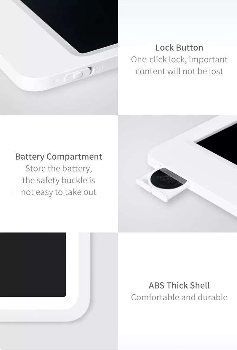 • If you clear the screen for 100 times every day, one button cell can last for 1 year.• Business tripEnjoy your trip for ultrathin and lightweight tablet.• Office discussionGroup discussion and convenient communication. You can write ideas from your team at any time, such as sketch, essay, brainstorming etc.• Family message boardThe message board improves happiness. Leaving your children, relatives and beloved ones a message on the board makes your life more ritual.• Parent-child interactionIt makes both parents and children enjoy good time.Children’s growth should be accompanied by parents. They can draw, make drafts, write on the board.• Writing AreaIt is easy to write, doodle, and draw on the writing area. In order to achieve a better writing experience and avoid screen surface damage, please use the stylus included with this tablet• Magnetic AreaThe sides of the tablet and the stylus are equipped with a magnetic function for easy storage• Clear ButtonPress this button to clear the screen content, when the lock switch is set to• Lock SwitchTo enable the clear function, set the lock switch to To disable clear function, set the lock switch to