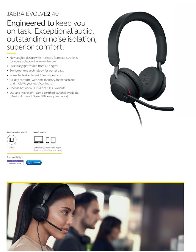 Jabra Evolve2 40 Stereo / Mono MS / UC Wired Headphones, USB-A / USB-C Noise Cancellation Headset [2 Years Warranty]