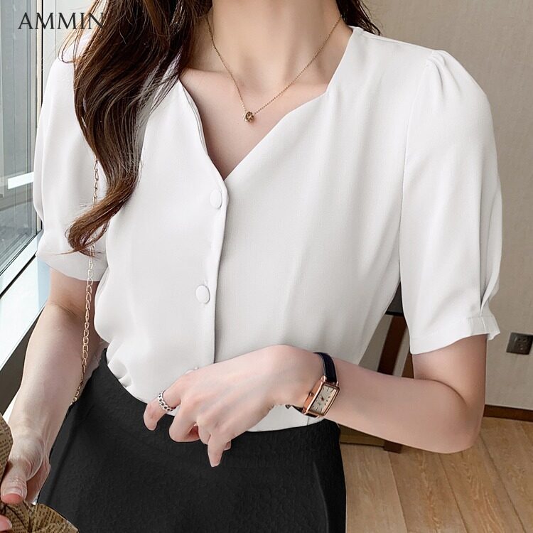 AMMIN Tops 2021 summer new style French retro square collar pleated short-sleeved blouse women's elegant temperament puff sleeve commuter button cardigan chiffon shirt