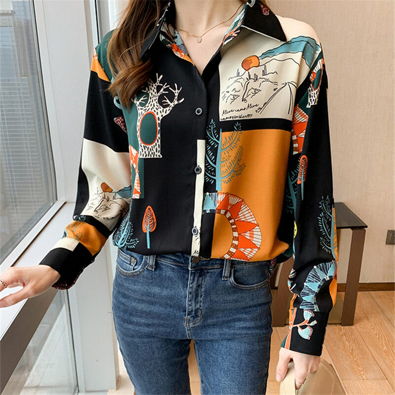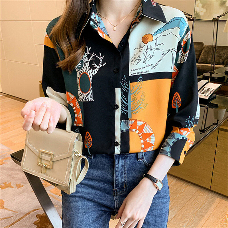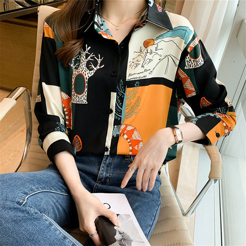 Vintage Shirt Women Korean Style Casual Printed Blouse Long Sleeve Chiffon Ladies Tops Loose Shirts