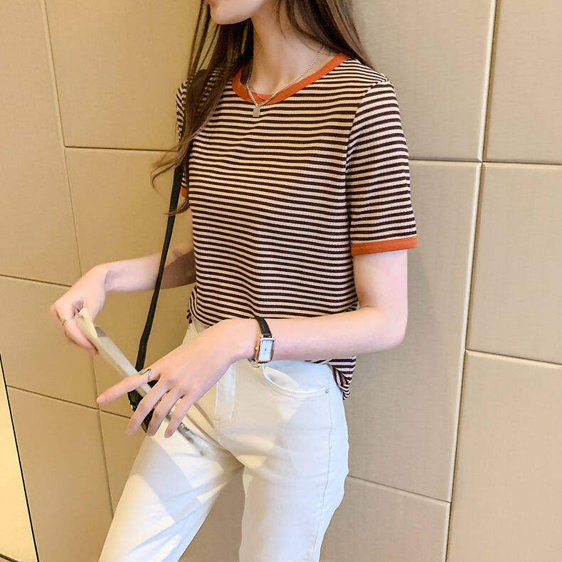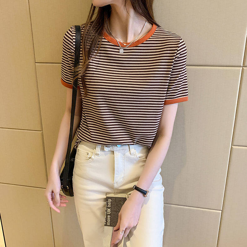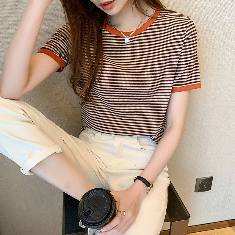 Yes-fashion T Shirt for Women Short Sleeve Casual Plus Size Korean Style Breathable Round Neck Stripes Shirts Loose Printed Tee Home Clothing Tops 0318