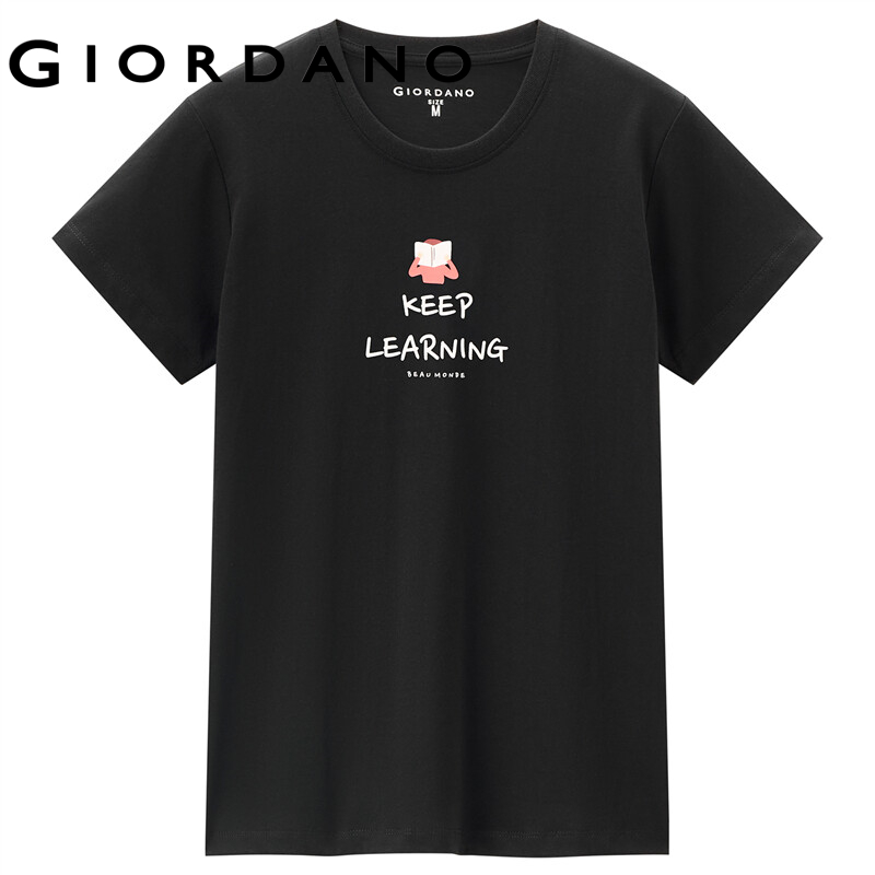 GIORDANO Women T-Shirts Short Sleeve Comfy 100% Cotton Casual T-Shirts Letter Print Ribbed Crewneck Simple T-Shirts 13392202