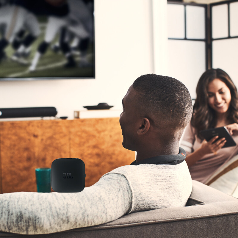 Introducing a totally new way of experiencing sound at home – by wearing it. Thanks to the JBSignature Sound wireless performance, the Soundgear creates your own personal sound zone while allowing you to remain fully aware of your surroundings. Bluetooth®-enabled for sound streaming from compatible devices, the JBSoundgear features Quad transducers with Bass boost for an exciting sound experience and 6 hours of playback time, a quick recharge time of 2 hours. Thanks to its dual mic conferencing system with echo-cancelling technology it provides crystal clear phone calls. The around-the-neck construction, ergonomic shape, intuitive controls, and soft touch fabric finish provide a hands-free and ears-free audio experience unlike any you’ve ever had before. Whether you want to give your VR experience a boost with immersive audio, watch a video, add music to your daily activities around the house or take a conference call, the JBSoundgear provides you with an exciting, pervasive sound experience with total freedom and comfort.