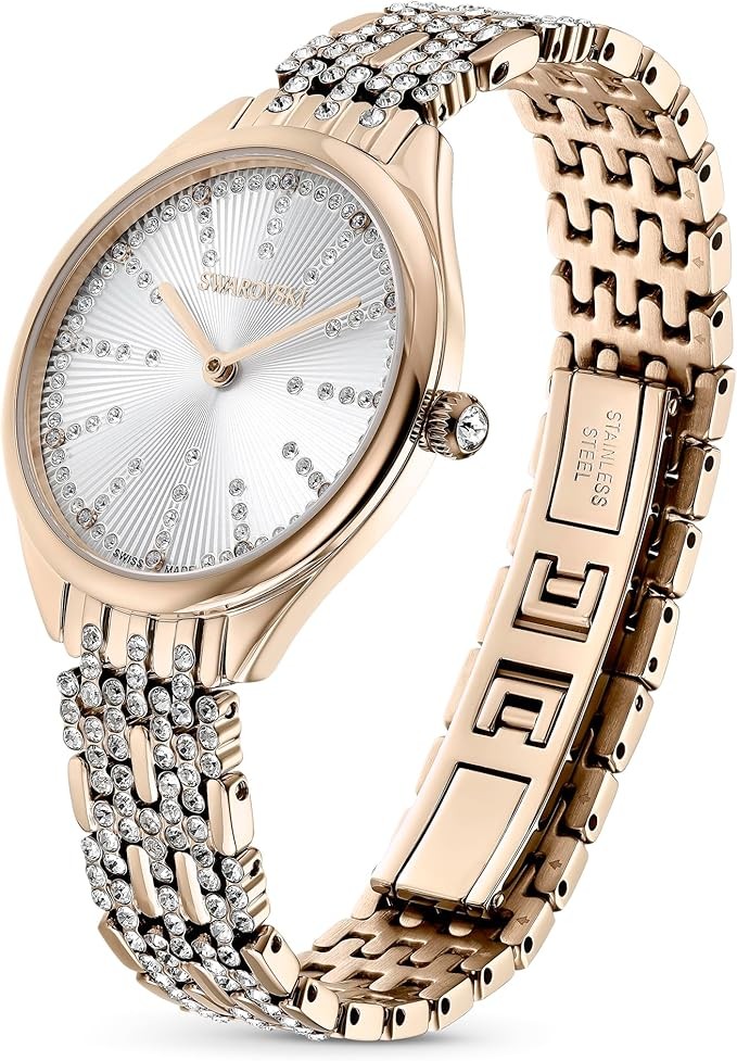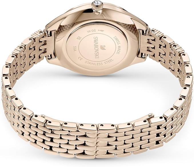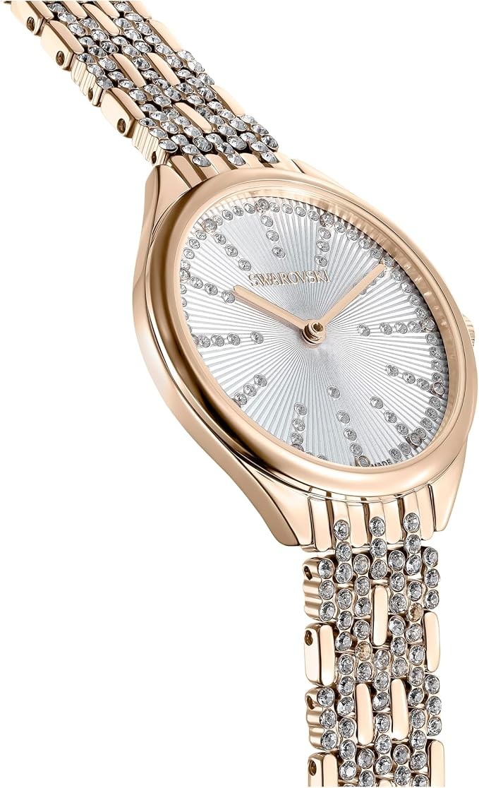Items delivered: (1) Swarovski Attract watch with guilloché dial and PVD-coated stainless steel casing on a champagne gold-tone finish metal band, complete with Swarovski watch box